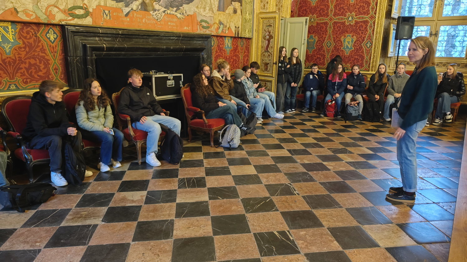 Der letzte Tag in Montfort… besser gesagt in Rennes, der Provinzhauptstadt der Bretagne. Nach dem langen Freundschaftsabend waren die Gesichter am Morgen entsprechend zerknittert. Zudem versprach die Wettervorhersage reichlich Regen für den Besuch in der bretonischen Metropole. Kaum angekommen begann es auch schon zu tröpfeln. Wir machten uns dennoch auf dem Weg zum Parlement de Bretagne, das in Wahrheit kein Parlament, sondern Straf- und Berufungsgerichtshof ist. Die überraschend erfrischende Führung auf Deutsch führte uns in das innerste der französischen Gerichtsbarkeit. Wie am Flughafen musste man durch Metalldetektoren gehen. Gleichzeitig wurde in den Rucksäcken nach Waffen und gefährlichen Gegenständen gesucht…. wie im Krimi! Eine kleine Aufregung war den Kids schon anzumerken. Als wir dann auch noch erfuhren, dass ein Teil des Parlements abgesperrt war („Huit clos“, … nein, das heißt nicht „acht Klos“ sondern „geschlossene Gesellschaft“), da gerade ein Strafprozess stattfand, war das Interesse der Deutschen noch mehr geweckt und Sherlock-Holmes-artig begannen die ersten kritischen Fragen: „Was hat der gemacht, der da vor Gericht steht? Warum ist die Öffentlichkeit ausgeschlossen? Wer sind die Leute da in der Halle, sind das Verbrecher?“… Dabei hätte das Gebäude an sich schon reichlich Aufmerksamkeit verdient. Der Bau aus dem 17. Jahrhundert, der zwei Brände einigermaßen passable überstanden hat, beeindruckte die Deutschen schon sehr. Vor allem der prunkvolle Veranstaltungsraum mit seinem reichhaltigen Dekor und den Deckengemälden zwar ein echter Hingucker. Die Schüler zeigten Interesse, stellten Fragen und beantworteten jene der kompetenten Führerin. Der kleine Berufungsgerichtssaal ähnelte dann schon eher den berühmt-berüchtigten RTL- und SAT 1-Gerichtsshow, die man so kennt, aber besser nicht zu oft schauen sollte, da man sich sonst das Hirn matschig macht.